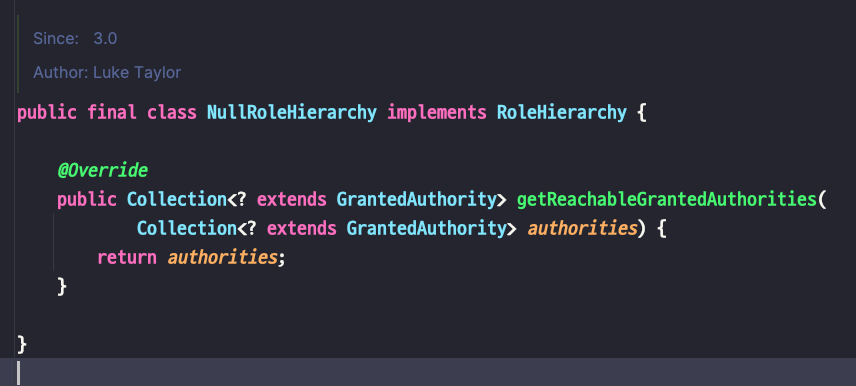 인스턴스 생성과 동시에 roleHierarchy 필드에는 아무런 동작을 하지않는 NullRoleHierarchy 구현체가 할당된다.