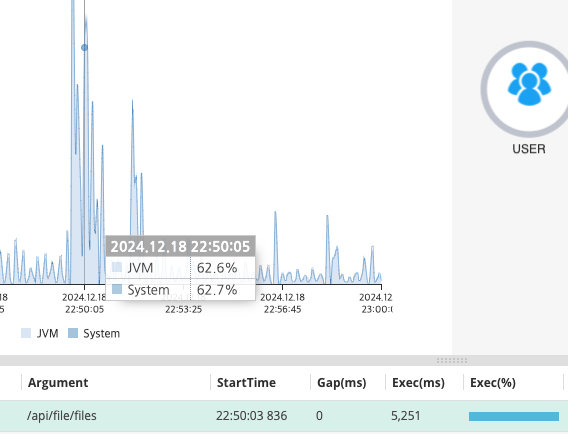 - CPU 사용량 급등: 최대 80%, 평균 50%