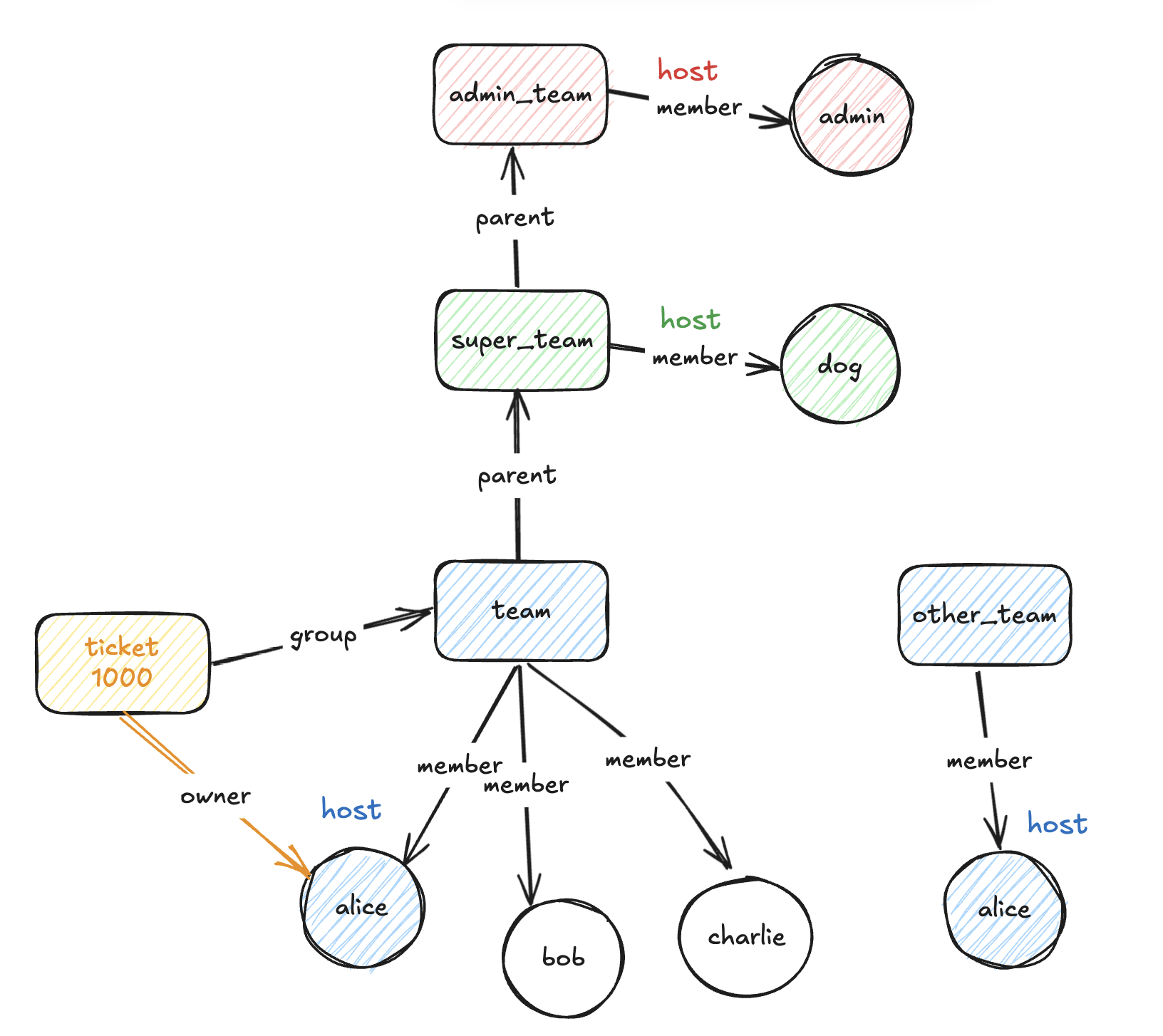 💡 그룹 team의 관리자(host)는 alice이며, alice, bob, charlie가 팀의 멤버(member)이다.
